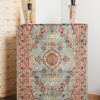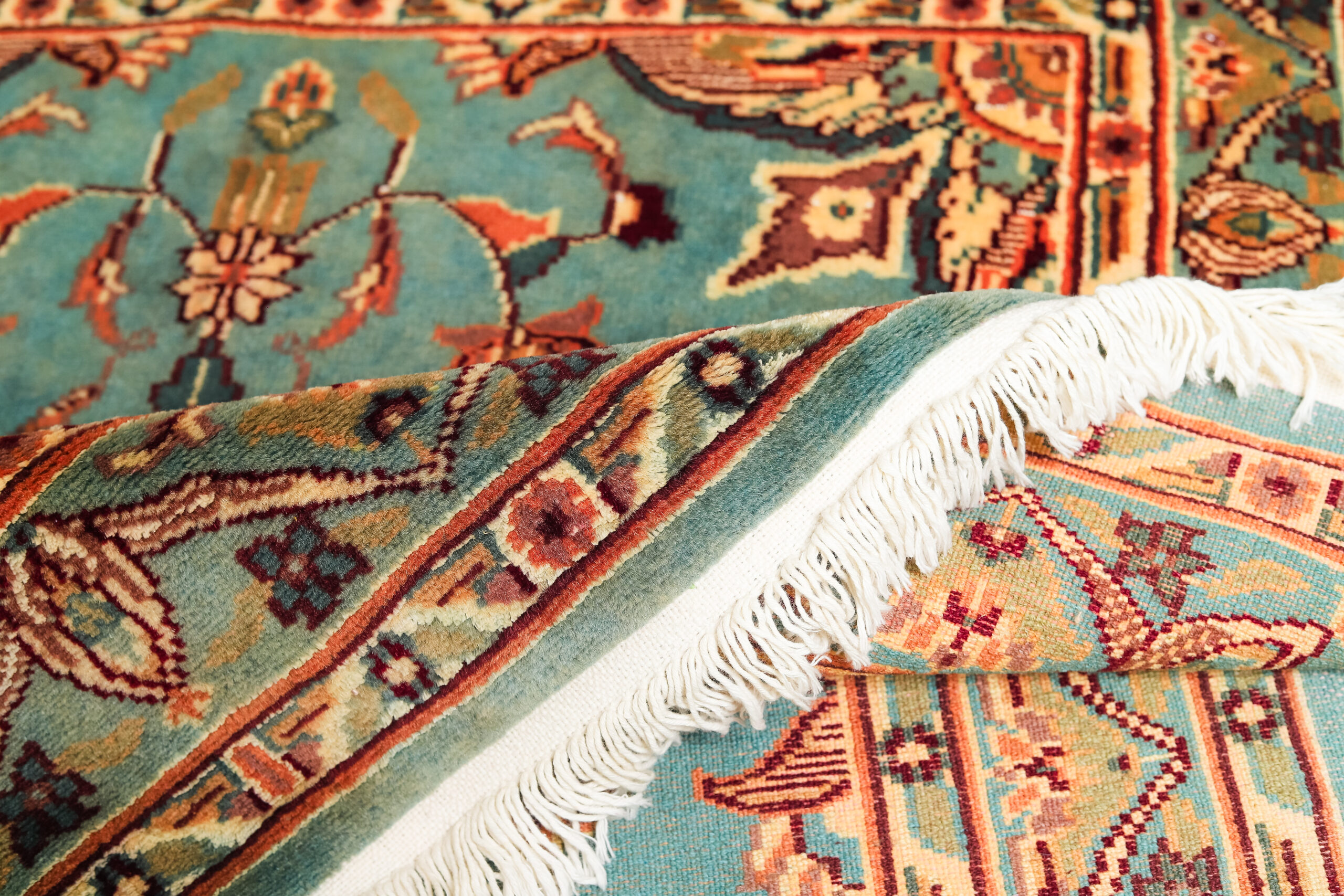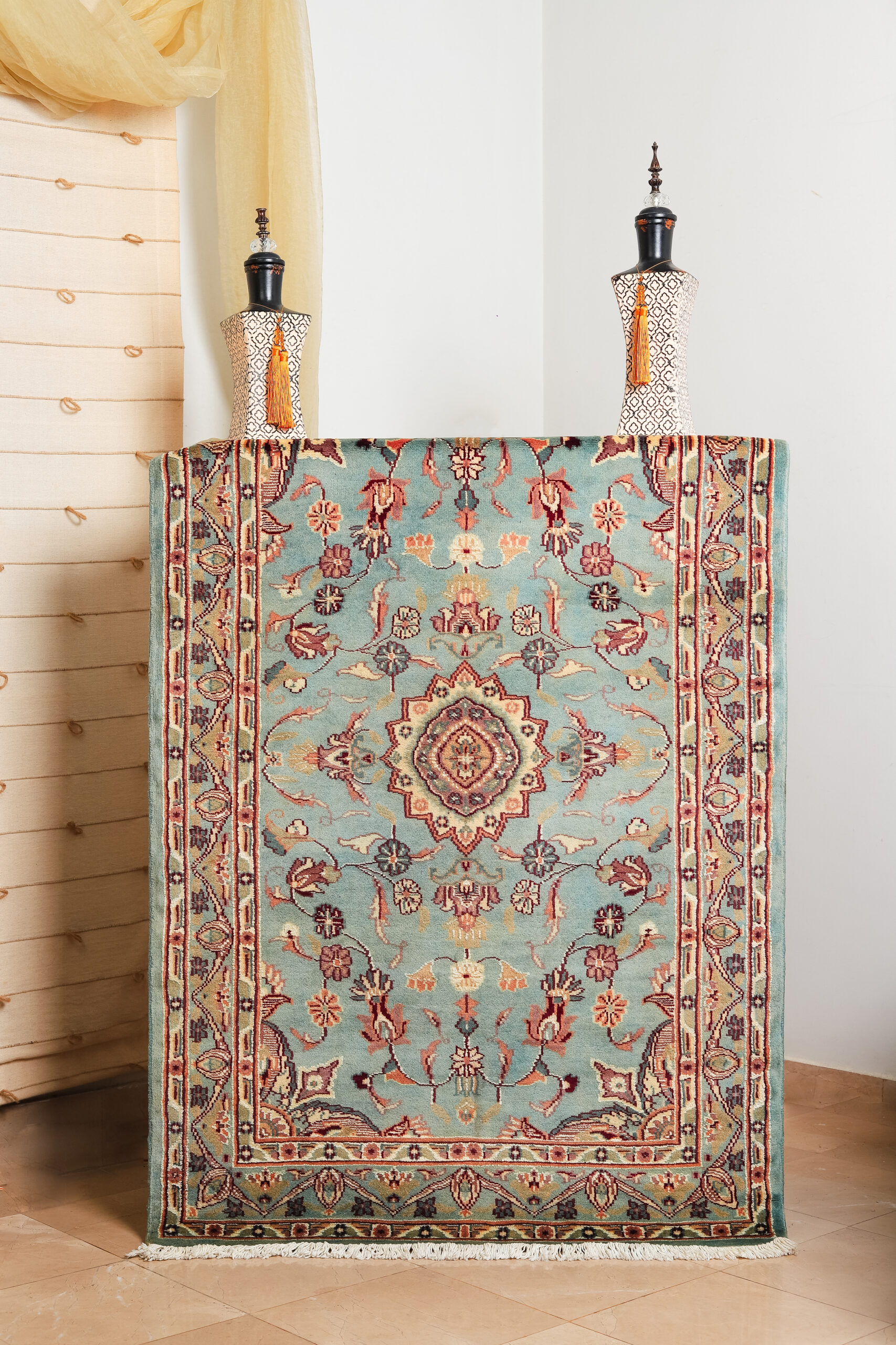 Enhance your home décor with this beautifully handwoven Pakistani carpet, featuring a luxurious aqua-blue background and detailed floral patterns. Crafted by skilled artisans, this rug showcases a traditional central medallion design, surrounded by elegant vines, blossoms, and a finely detailed border. Its soft color palette—blues, creams, maroons, and subtle gold accents—makes it a perfect addition to both classic and modern interiors.