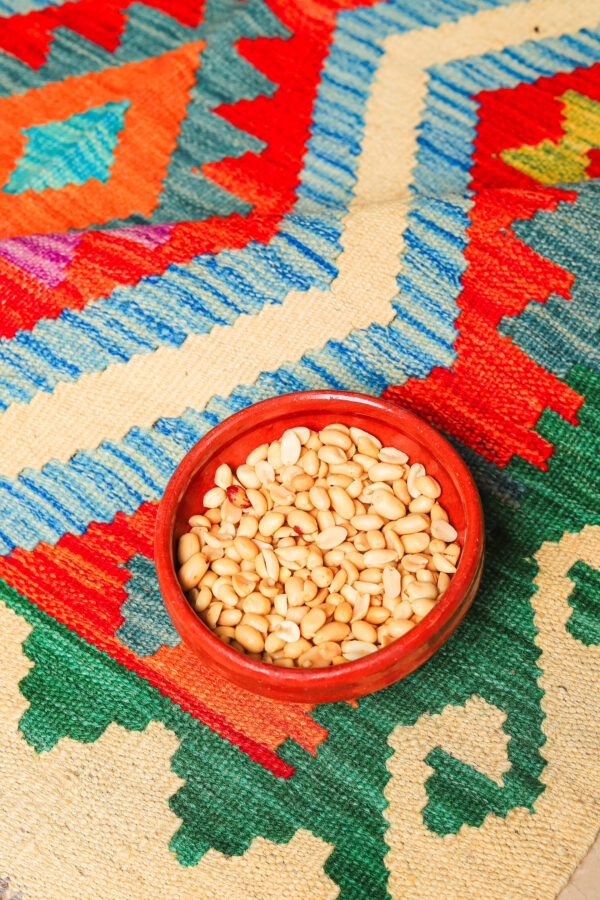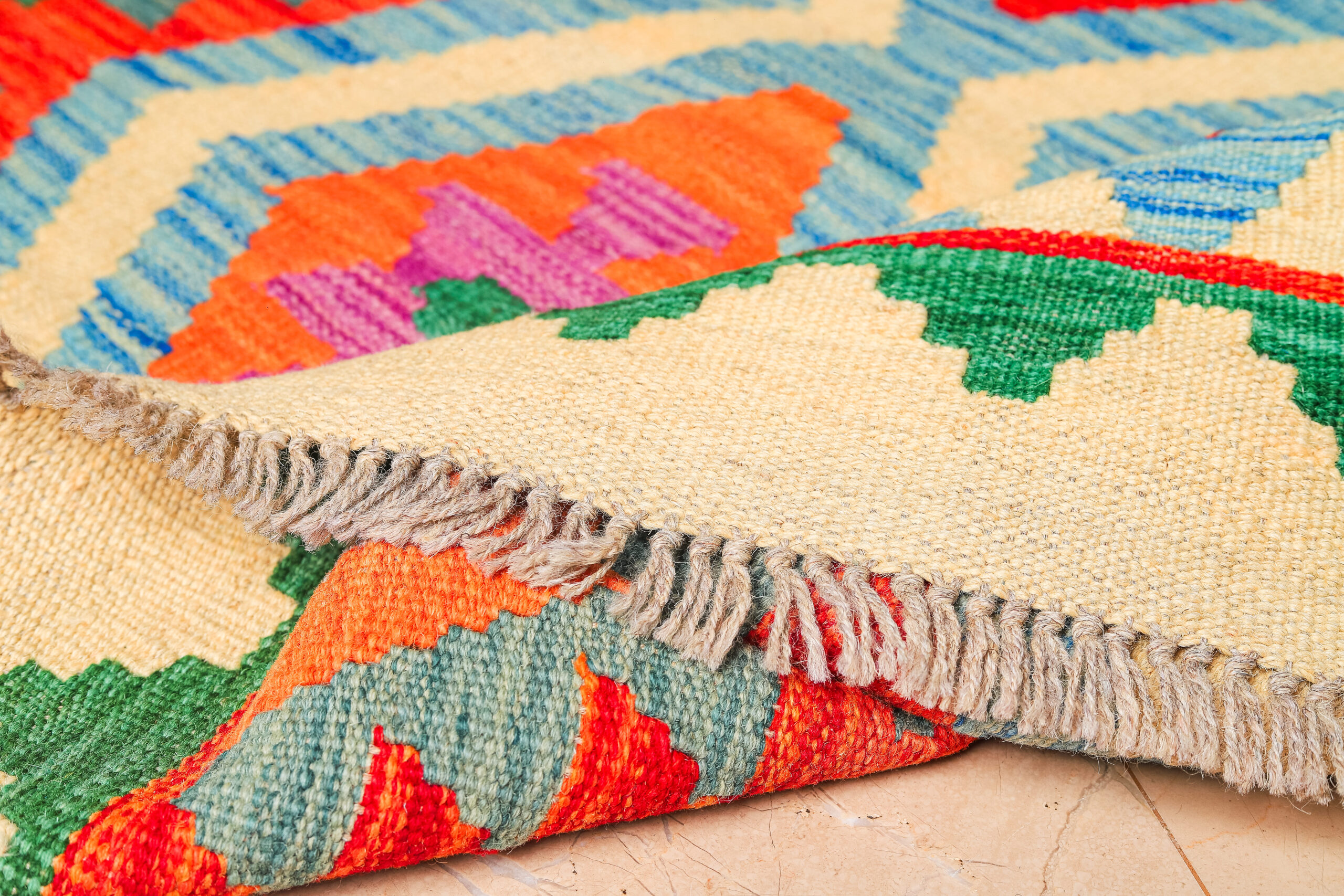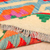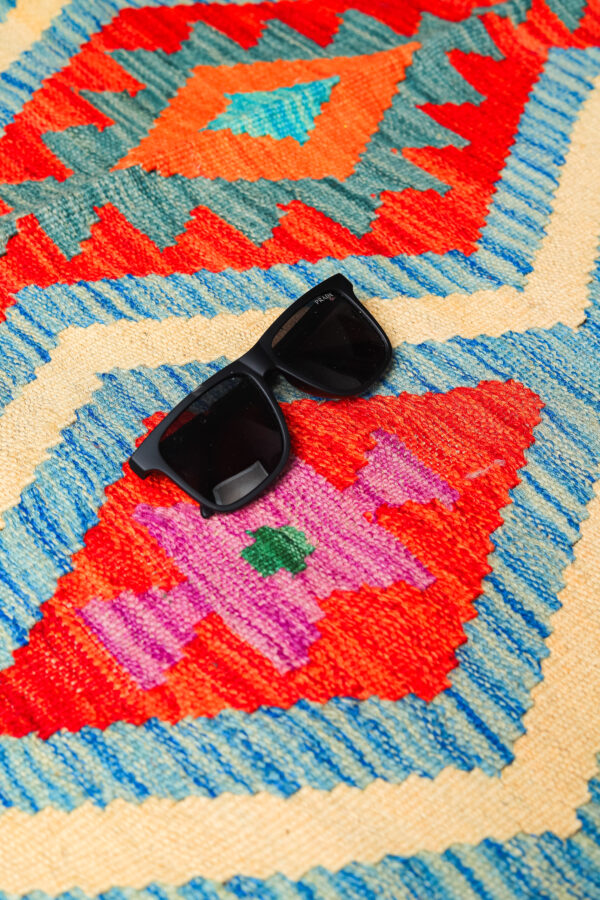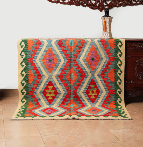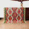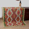 This Afghan Kilim rug features a vibrant and intricate geometric design, showcasing bold patterns in an array of colours such as red, orange, yellow, green, and soft blues. The combination of diamonds and angular shapes creates a striking visual effect. Handwoven with precision, this Kilim offers both elegance and a rich cultural heritage. The natural tones of the background highlight the intricate motifs, making it a perfect addition to any space looking for a touch of traditional craftsmanship and bold colour contrast. Whether displayed in a living room or hallway, this rug will bring a timeless, earthy warmth to your home.
