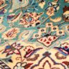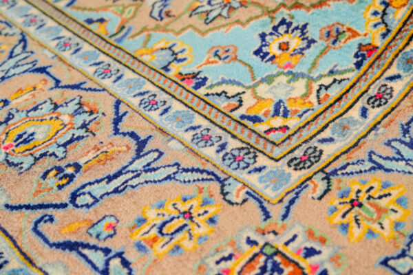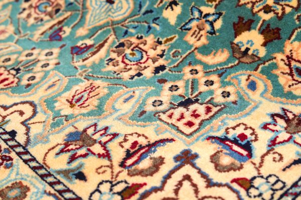 This particular Irani Kashan rug features a refined ivory and beige field adorned with intricate floral motifs arranged around a beautifully detailed central medallion. Accents of turquoise, soft brown, deep blue, and warm red add depth and elegance to the design, creating a visually rich yet harmonious composition.