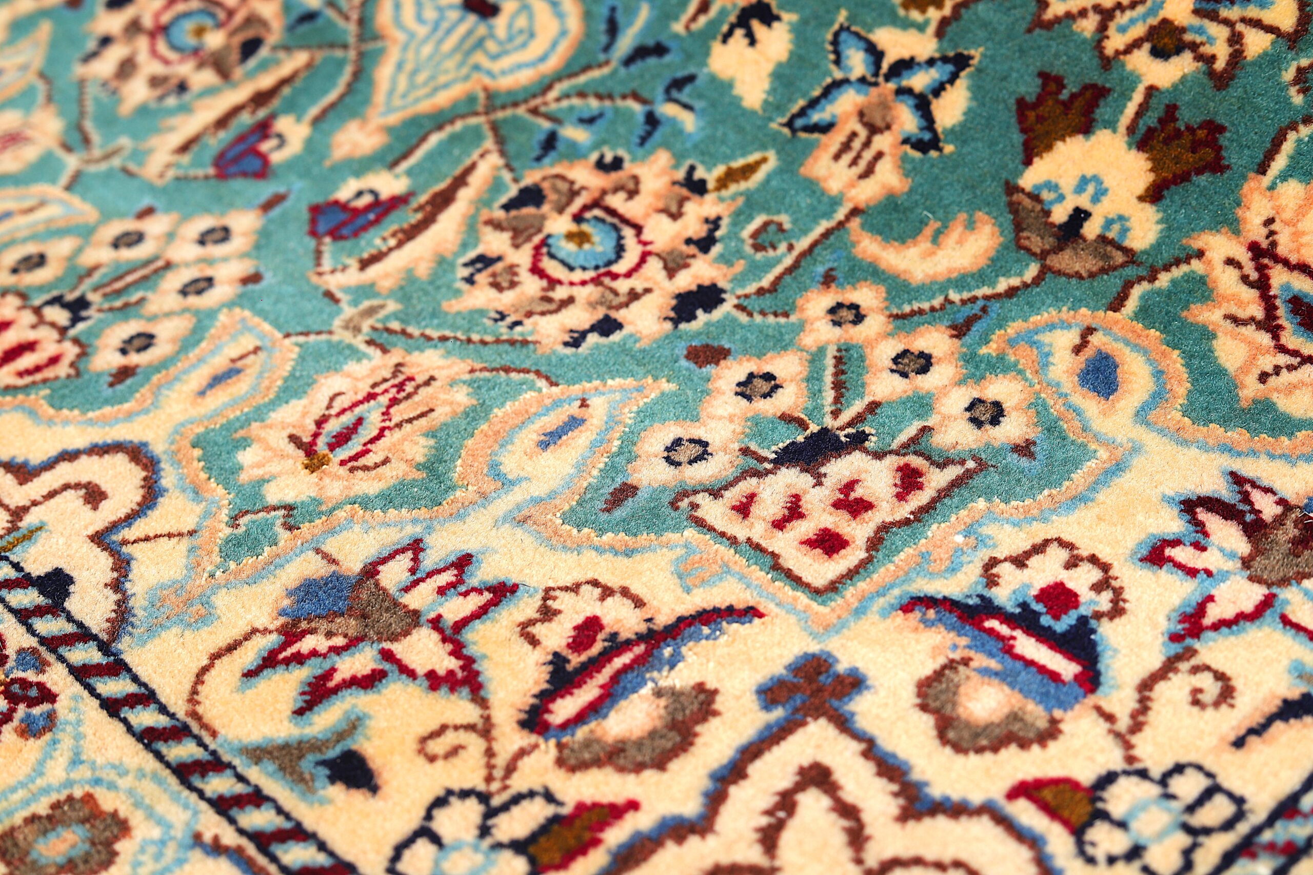 Colour: Ivory and beige field with turquoise, soft brown, deep blue, and warm red