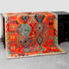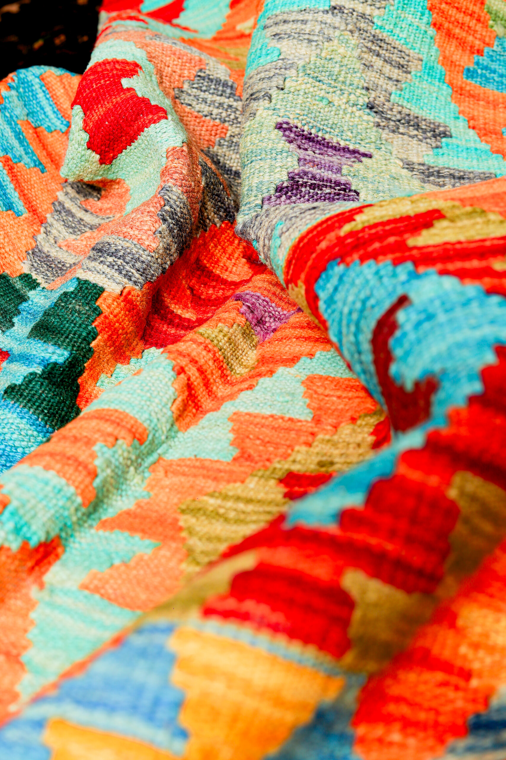 This particular piece features a striking mix of bright reds, turquoise blues, greens, oranges, and earthy tones, arranged in classic diamond and hooked motifs. Its vivid color palette and tribal geometric design make it a perfect statement piece for modern, bohemian, or ethnic-inspired interiors.