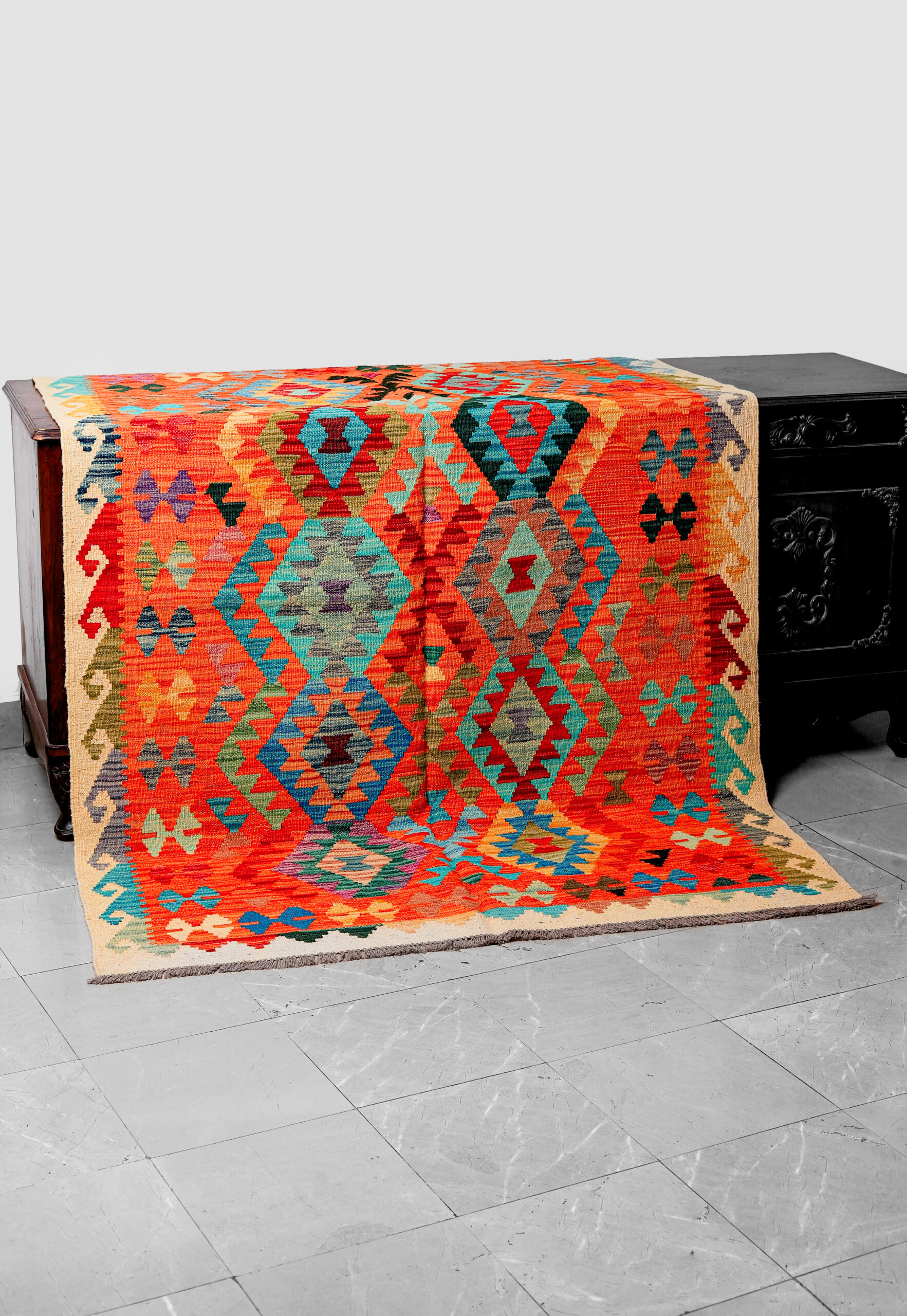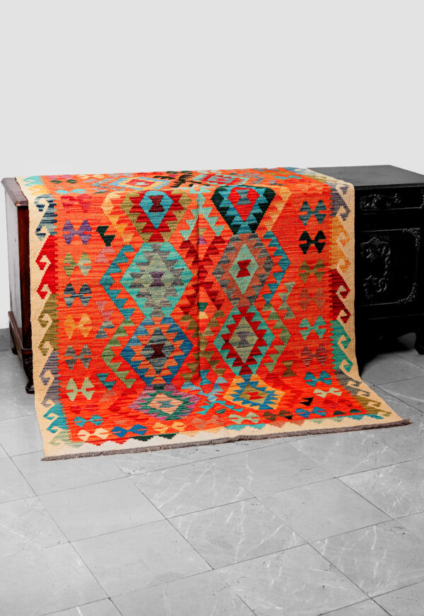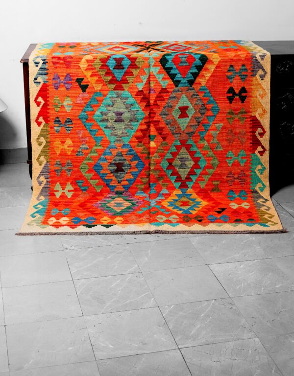This beautiful Afghan Kilim is a vibrant example of traditional flat-weave craftsmanship, handmade by skilled Afghan artisans using high-quality natural wool. Known for their lightweight and durable structure, Afghan Kilims are celebrated worldwide for their bold geometric patterns and rich cultural heritage.